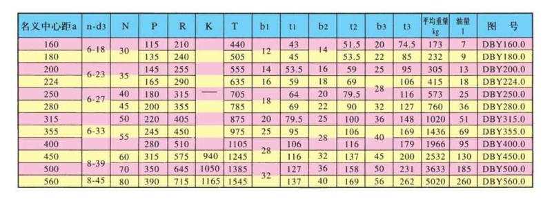 DBY、DBYK、DBZ型減速機各有12種規格,名義中心距為:160,180,200,224,250,280,315,355,400,450,500,560mm每種規格均有5種傳動比(8,10,11.2,12.5,14)兩種旋向,四種裝配型式,分別組成240種減速機。