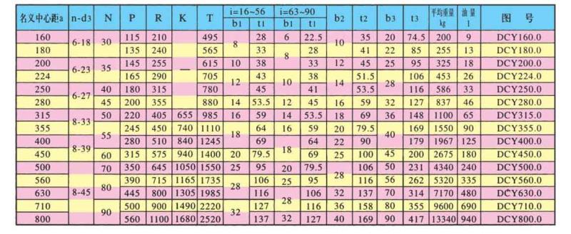 DCY、DCYK、DCZ型減速機各有15種規(guī)格,名義中心距為:160,180,200,224,250,280,315,355,400,450,500,560,630,710,800mm;每種規(guī)格均有11種傳動比(16,18,20,22.4,25,28,31.5,35.5,40,45,50)兩種旋向,四種裝配型式,分別組成660種減速機。